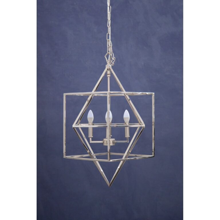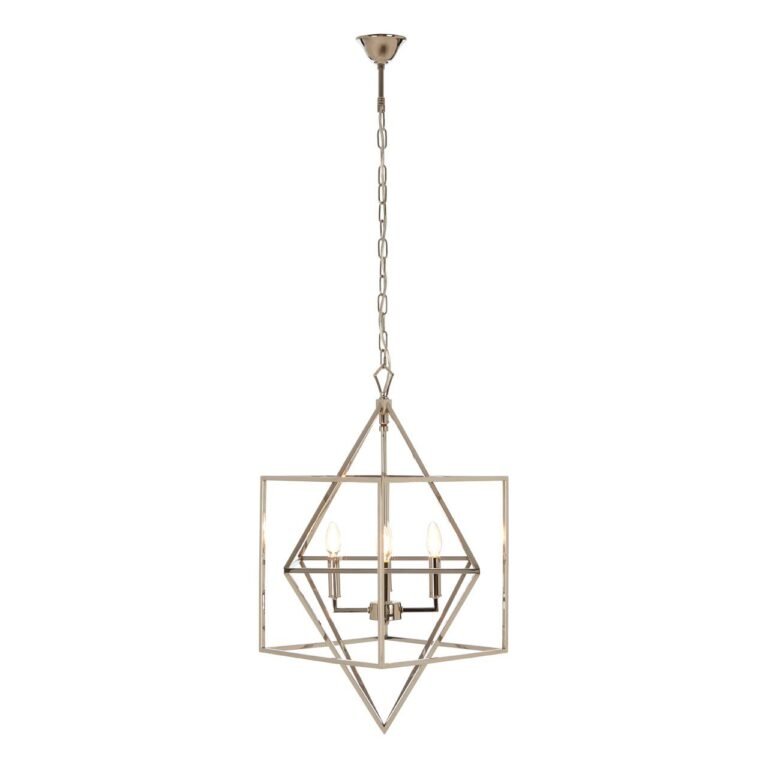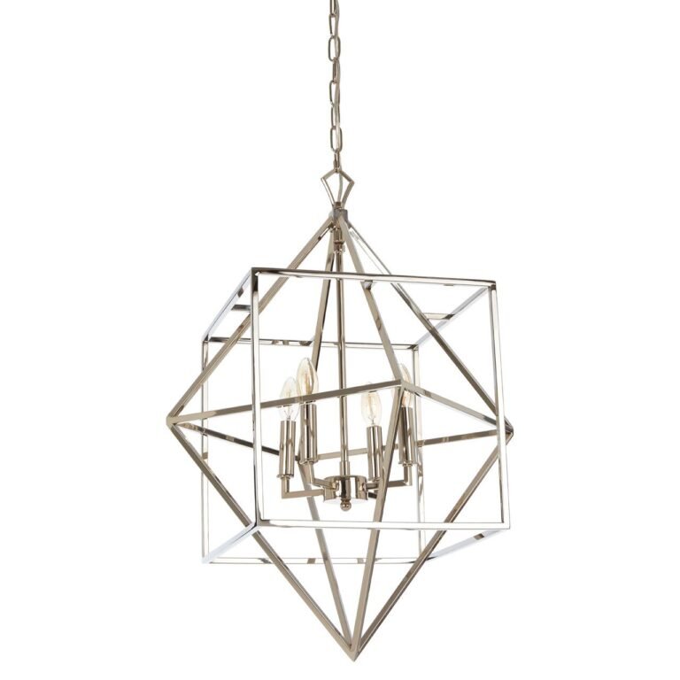 Pendle Square Design Chandelier: The chandelier has a modern frame created from slender strips of nickel-plated stainless steel, comprising a striking geometric design, with a diamond shape situated inside a cube.