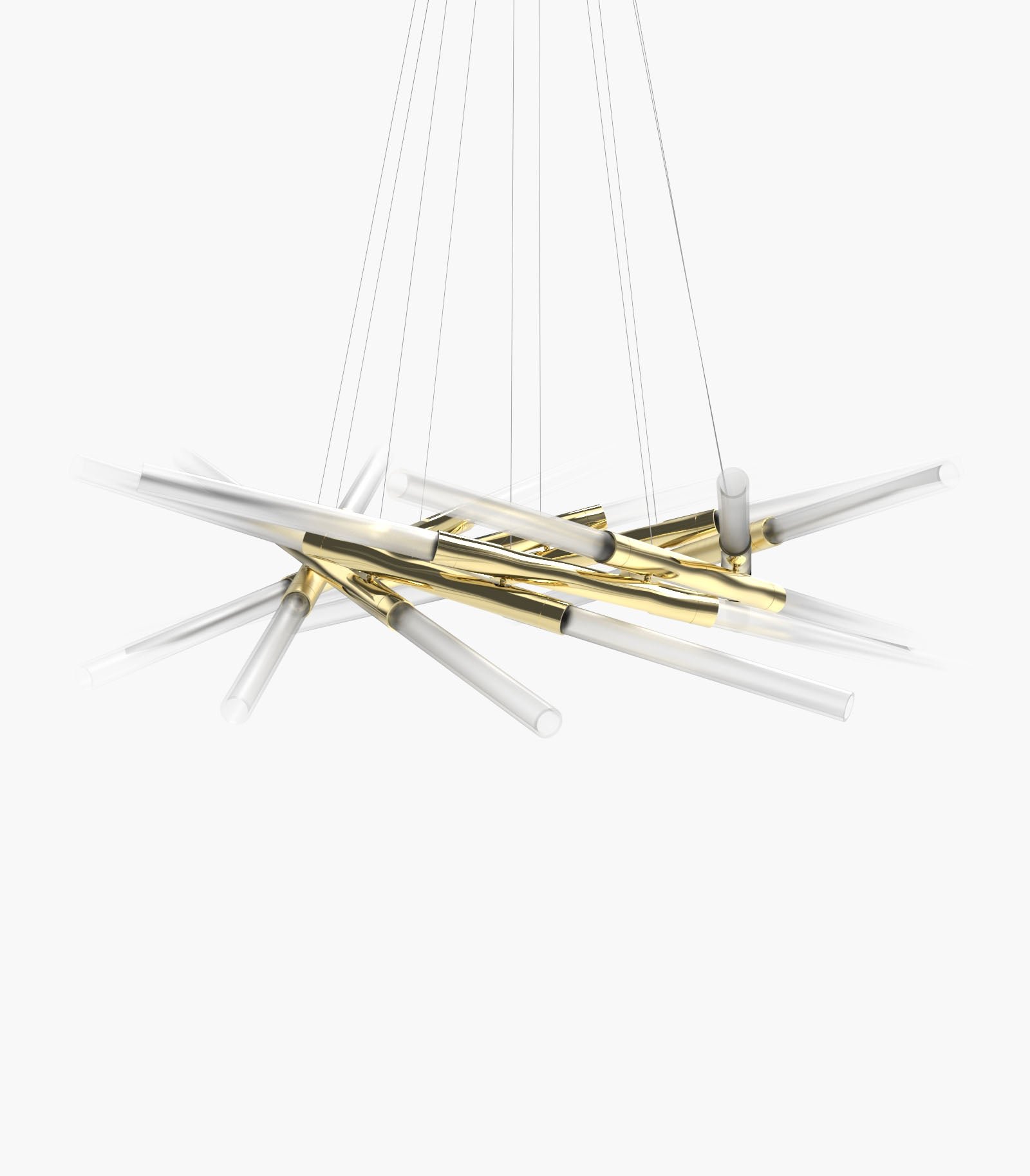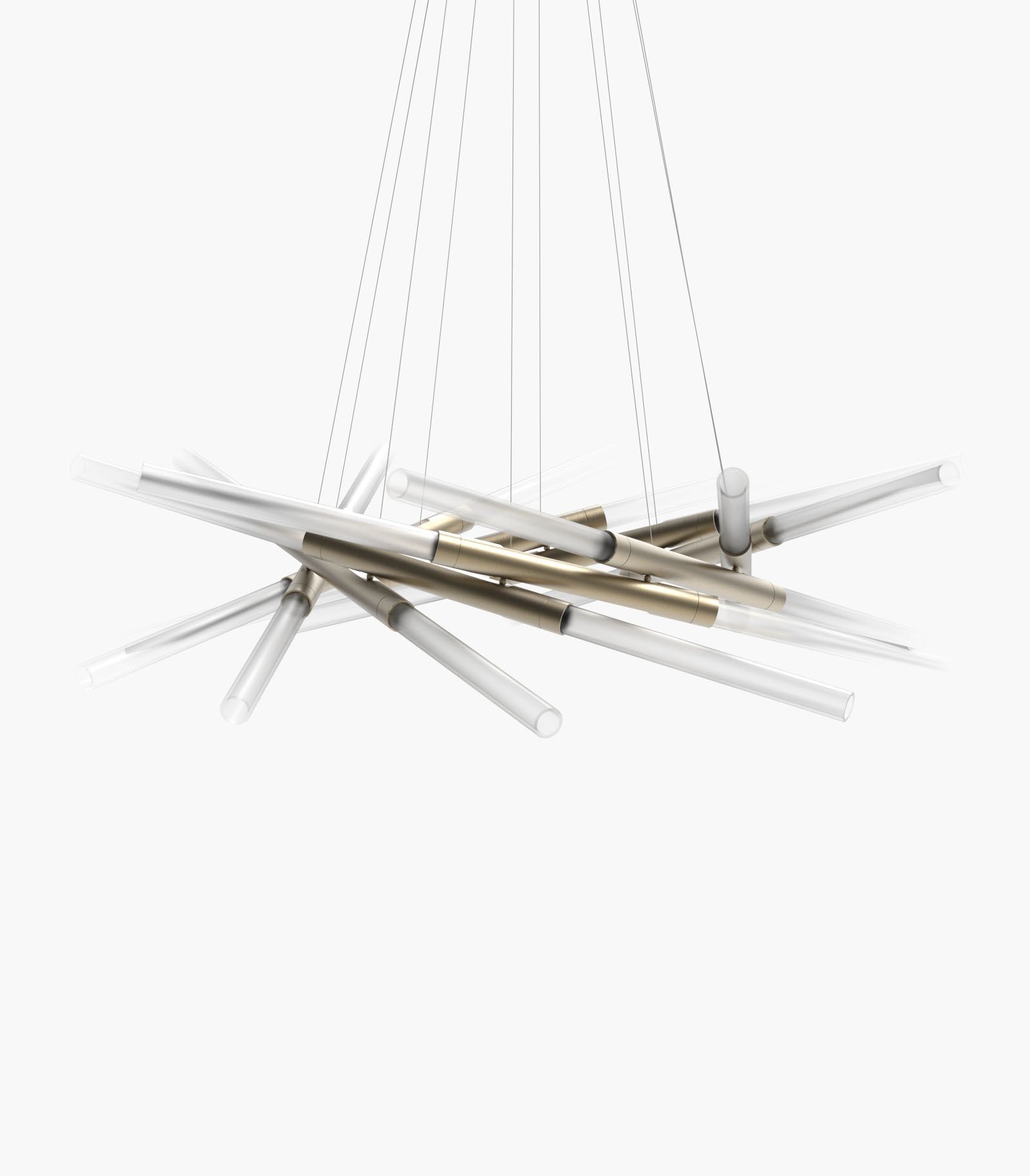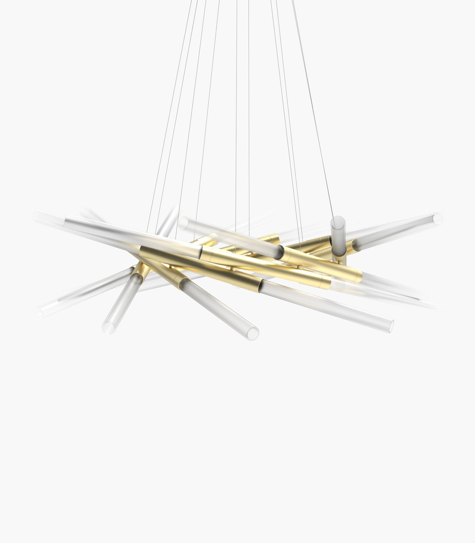 A frosted ombre glass pendant with a turned brass body. The body is machined from solid brass or aluminium depending on finishing choice. Available as a singular pendant, or together as an interconnecting configuration.