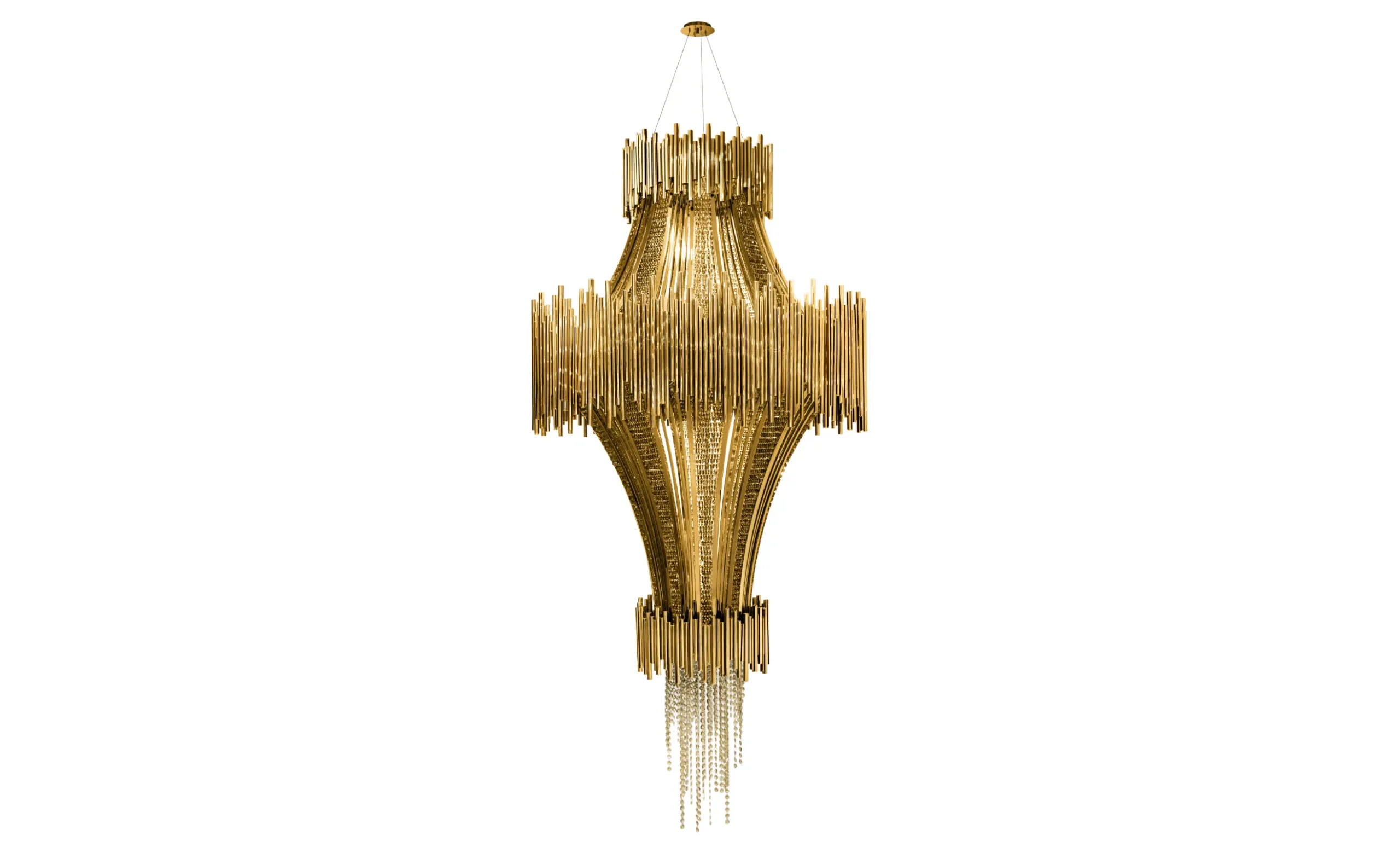 The Scala Chandelier is a poetic masterpiece made with the most beautiful crystals. All the details of its design are so unique that they have the power to create not only a perfect space but also get you involved in passionate emotions. Made with gold-plated brass and golden teak crystals, the Scala Chandelier will make a statement in any hospitality project or residential setting.MATERIALS