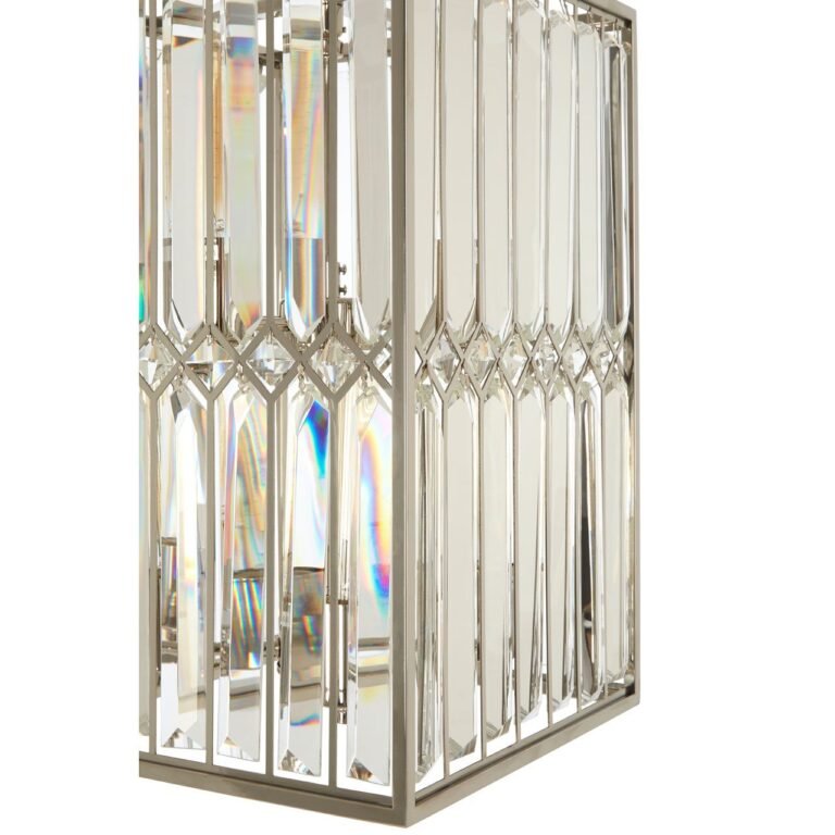 Sherb Cylindrical Chandelier: Supported by a strong frame created from stainless steel, the chandelier boasts a muted nickel plating, harmonizing with the clear crystal glass. A simplistic criss-cross design adds a decorative geometric element to the chandelier’s centre.