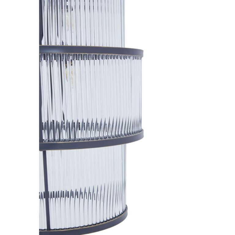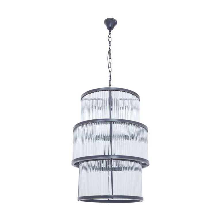 This Tarte Black Finish 3 Tiered Glass Chandelier has dozens of transparent glass panes raked manually to create a ribbed pattern. The three tiered drum-shaped glass produce an ambiance of dim light and a diffused glow.