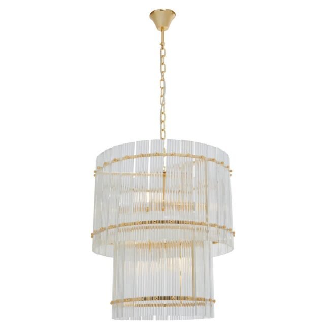 Tizia Six Bulb Pendant Light: This six bulb pendant light is a timeless classic which brings ambience to the living area. The sleek two-tier metal frame in the warm metallic finish is complete with an array of fluted glass strips in a rectangular shape creating a warm glow.
