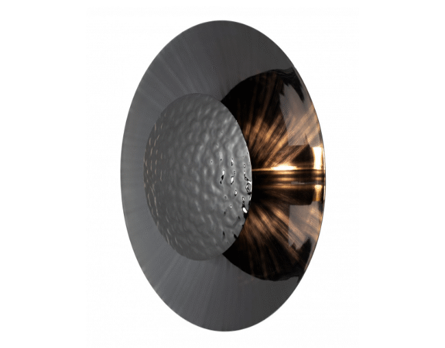 Recreating this natural wonder, the Eclipse gold wall sconce is composed of two rounded brass plates, placed in front of each other, with a slight distance between them, only allowing little crescents of light to shine through. The front plate is hammered by hand, using modern handcraft technics, that reflects in the shining gold plated plate in the back.