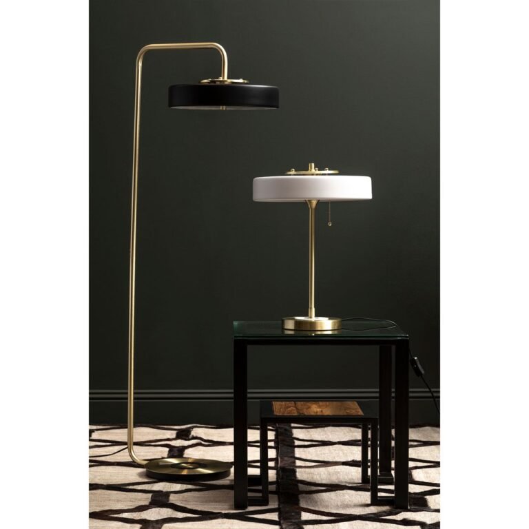 Ganor Floor Lamp: This floor lamp introduces clean sophistication with sleek and minimal base in the warm brass stand. The luxe tubing is supported with a round base while it gently bends to support a spun frame in the black finish.