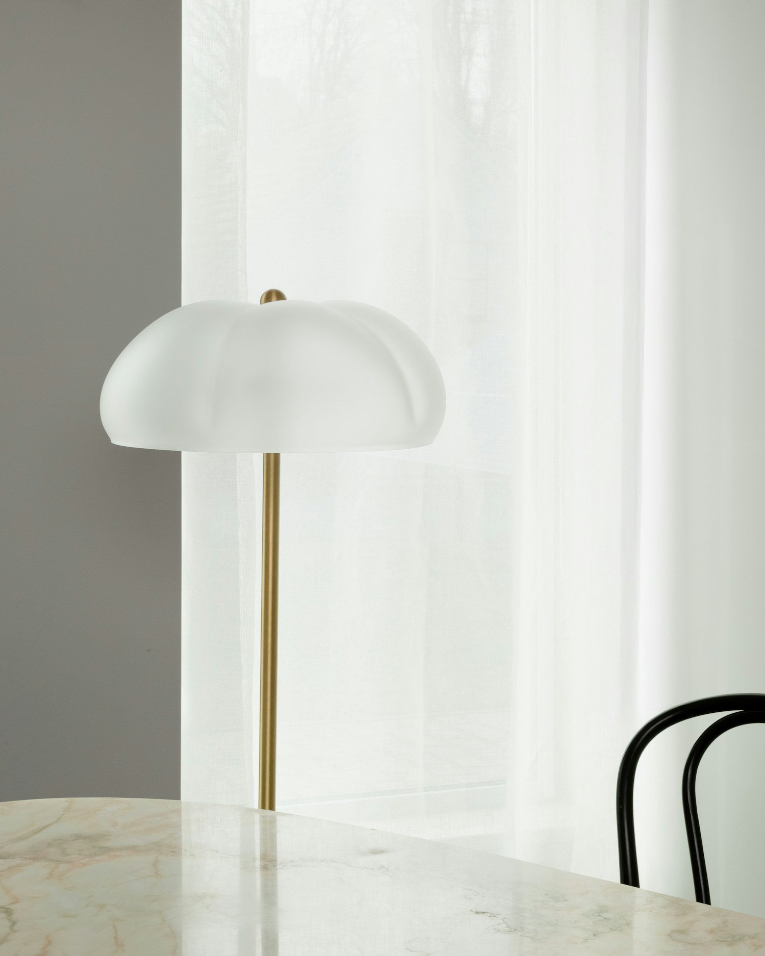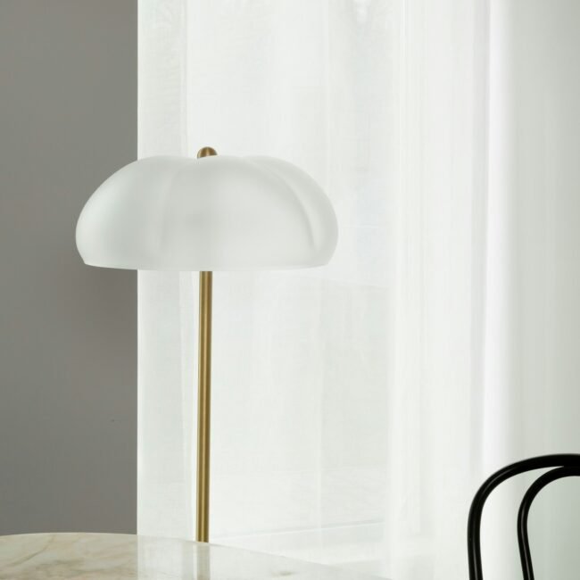 Drawing inspiration from the essence of nature, this exquisite milk-frosted glass cloche, paired with a brass structure, is crowned with a matching, subtle button. Mirrored at the base, it seamlessly serves as a dimmer, inviting one to sculpt the perfect glow.