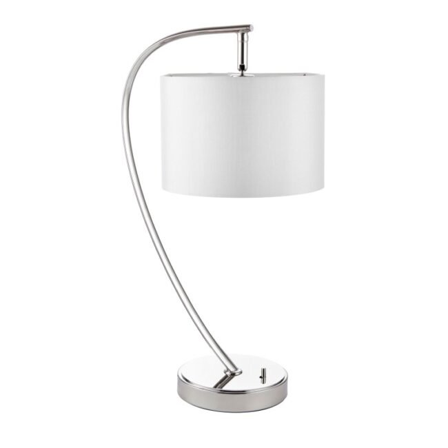 An elegantly arched table light finished in bright nickel plate and teamed with a vintage white faux silk shade. Compatible with LED lamps.