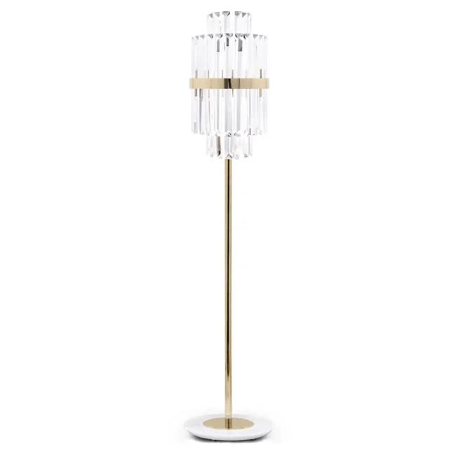 Inspired by the Statue of Liberty, this floor lamp will brighten any space with its delicate and rich lines. Its design is a flawless combination of gold-plated brass and crystal glass with a marble base. The Liberty Floor Lamp will be the perfect complement to add harmony and elegance to any project.MATERIALS