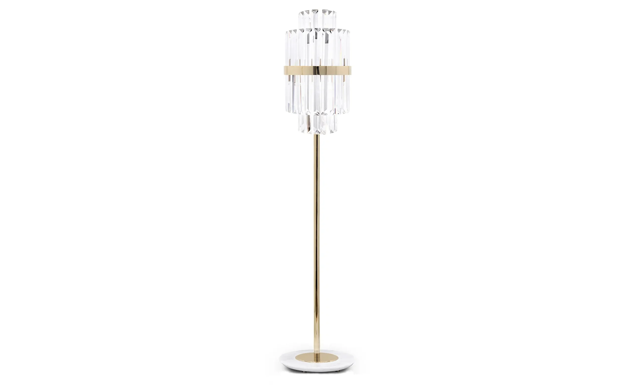 Inspired by the Statue of Liberty, this floor lamp will brighten any space with its delicate and rich lines. Its design is a flawless combination of gold-plated brass and crystal glass with a marble base. The Liberty Floor Lamp will be the perfect complement to add harmony and elegance to any project.MATERIALS
