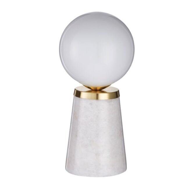 Create an ‘on-trend’ look with this floor lamp. The combination of gloss white glass, brushed brass plated metalwork and the white and grey marble base completes the smart Scandinavian look. Create the perfect illumination when paired with filament LED lamps.