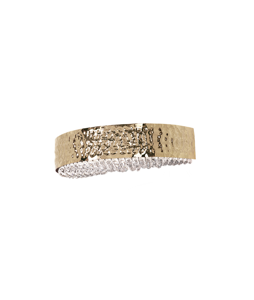 Conceived to incorporate traditional techniques and modern design influences, this lighting, unlike the rest of the collection, has an extra golden ring, both made in gold-plated brass and hammered by the hands of experienced lighting design artisans who also adorned it with individually assembled Crystals.