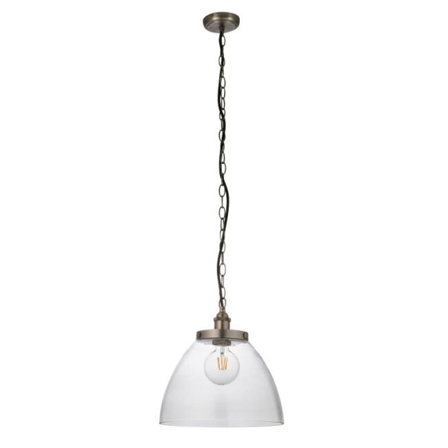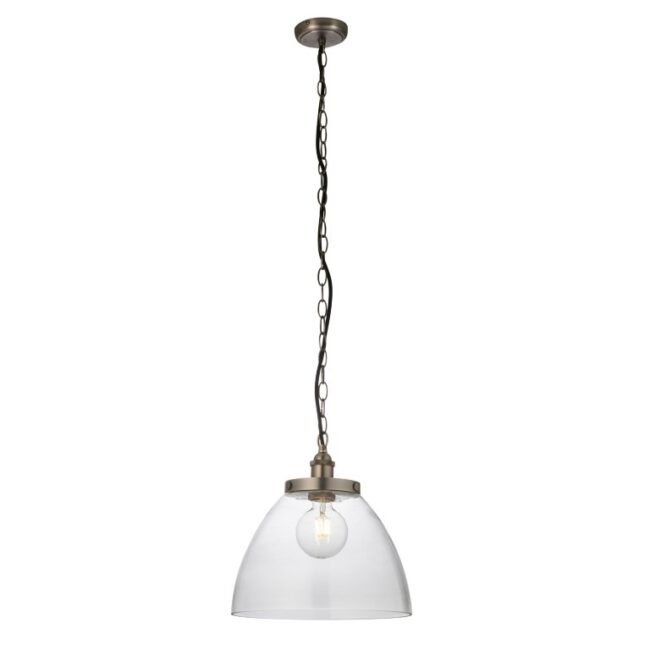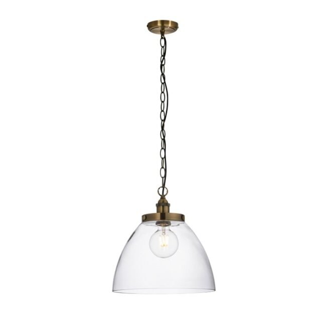 An authentic ‘resto’ style industrial pendant, finished in antique brass finished metalwork with authentic knurled lamp holder details and clear glass shades . Suspended from height adjustable black fabric flex, pair with filament LED lamps for that perfect industrial style. The perfect addition for today’s stylish homes to create that on trend bar, bistro look. Also available in other sizes and finishes to complete the look.
