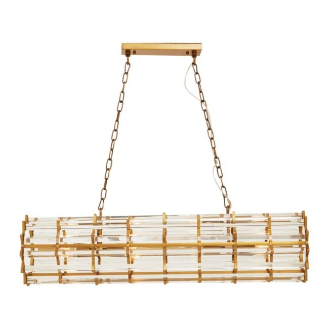 This light glimmers with layered strands of clear bevelled glass wrapped around a sturdy frame finished in brass using cylindric horizontal placement.