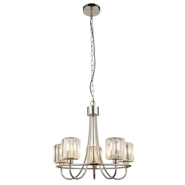 Sophisticated 5 light pendant with decorative clear cut faceted glass shades that beautifully disperse the light. Elegant arms in a bright nickel plate finish; perfect for hanging in any living space. Other matching items available.