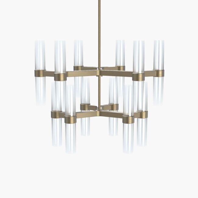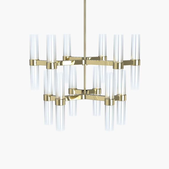 Frosted cylindrical glass tubes sit within a tiered brass structure. Made with engineered glass and machined from solid brass or aluminium.