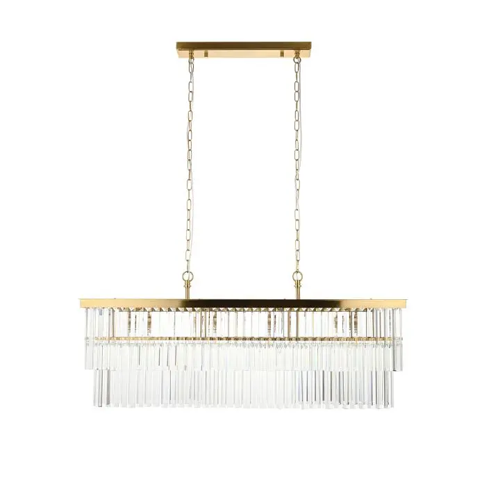 Cornerstone 4 Bar Pendant Light Brushed Aged Brass: Sleek and sophisticated, this 4-light linear pendant is designed to bring refined glamour to elegant dining rooms. A series of angled glass droppers cascade from a shaped metal band, catching the light for a dazzling effect. Suspended from twin height-adjustable chains, the balanced, elongated form makes it ideal for positioning over dining tables or kitchen islands, offering both ambient glow and visual drama.