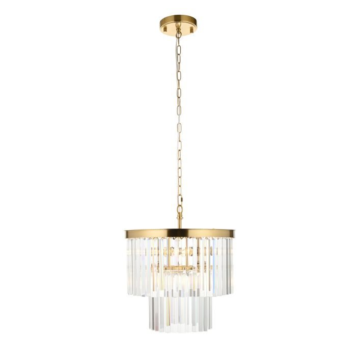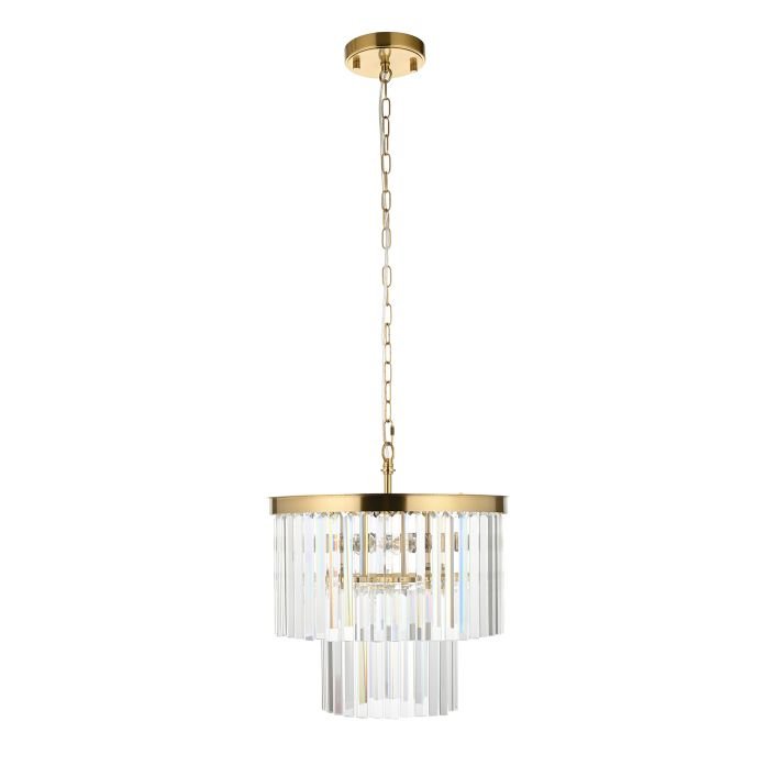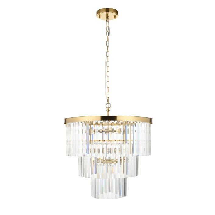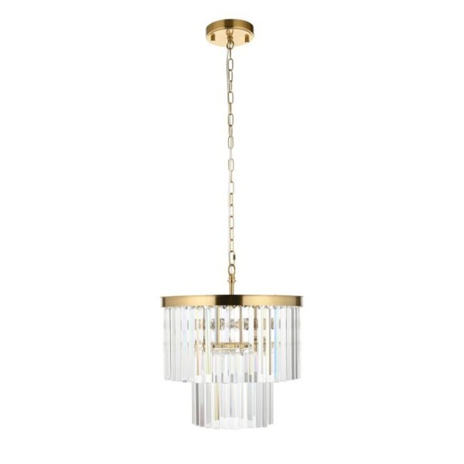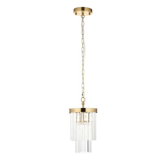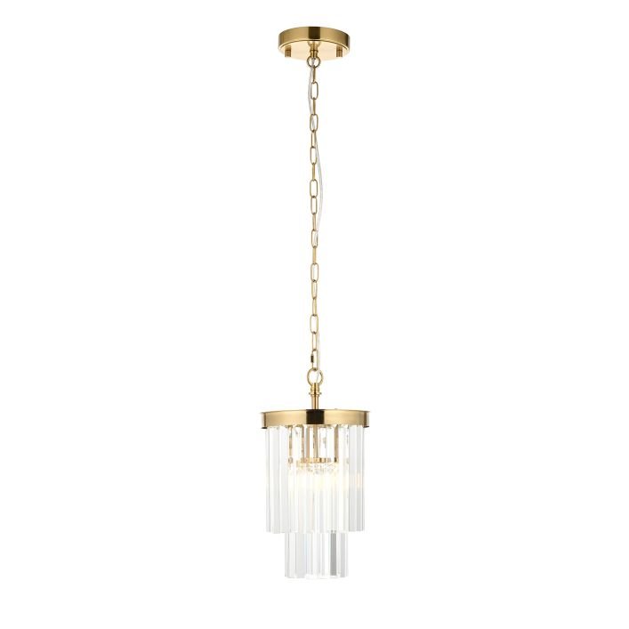 Cornerstone Pendant Light: Radiating elegance and luxury, this pendant light features a striking arrangement of angled glass droppers that cascade gracefully from a warm brass metal frame. The tiered design catches and reflects the light beautifully, creating a sparkling ambiance perfect for dining spaces, hallways, or statement corners. Sophisticated and glamorous, it adds a touch of Art Deco-inspired refinement to any interior.