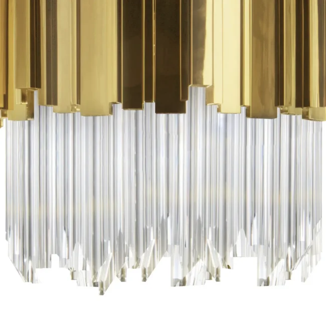 The Empire Pendant Small Lamp is a modern lighting fixture crafted with gold-plated brass and crystal glass. Its iconic design exudes effortless elegance, suitable for any luxurious setting, whether as a standalone piece or paired with others to create an ambiance of elevated refinement.MATERIALS