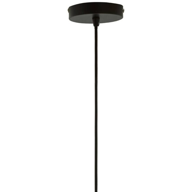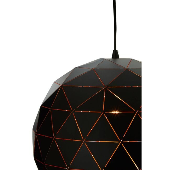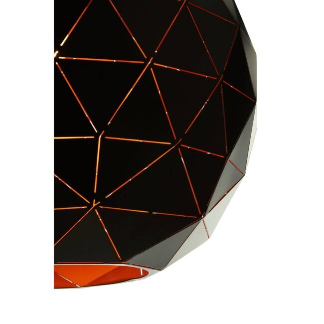 The shade is composed of a series of triangular forms made from tough steel. Slivers of space separate each segment, and when lit this allows small shards of light to escape. The deep black finish and exquisite copper interior make it easy to coordinate with a range of design themes. A simple black cord suspends the light from the ceiling.