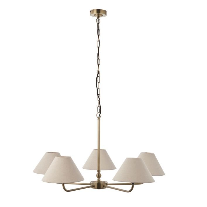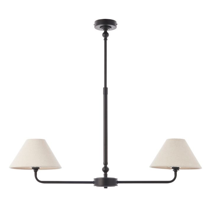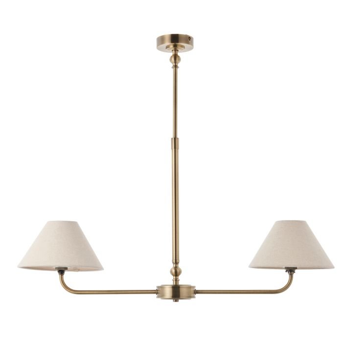 Franc Pendant Light: This elegant pendant is finished in antique brass plate and features timeless tapered shades in natural linen fabric. Its linear shape makes it perfect for positioning over dining tables and comes complete with a height adjustable telescopic stem and B22 lamp holders for an authentic classic look.