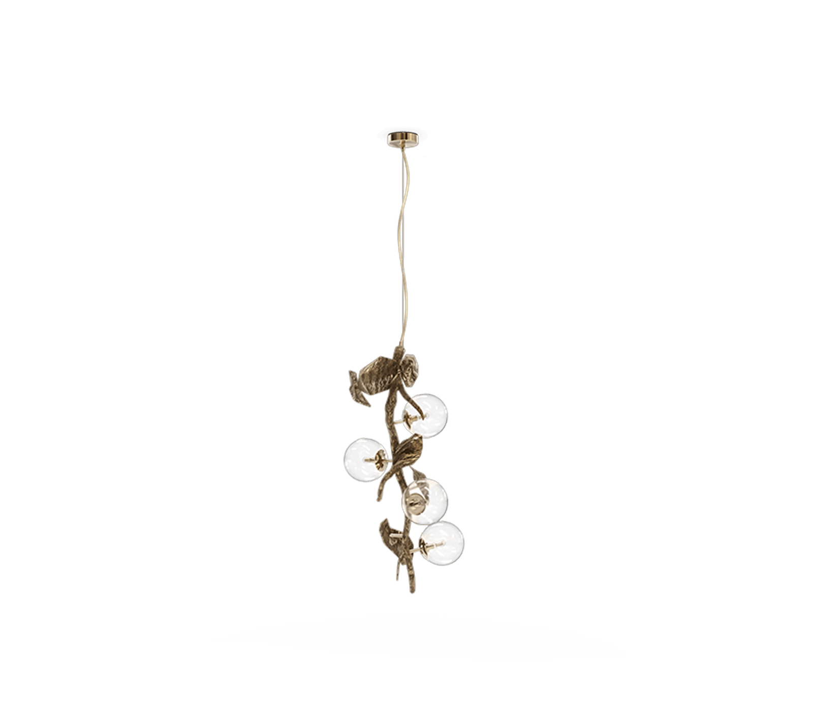 The lighting pendant is moulded to resemble the features and look of a golden branch freely suspended from a single string. Handmade from cast brass, this lighting has an organic shape and intricate contemporary details to create an adjustable arrangement in a harmonious ensemble. Suitable for contemporary interiors.