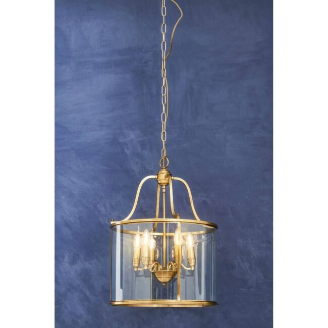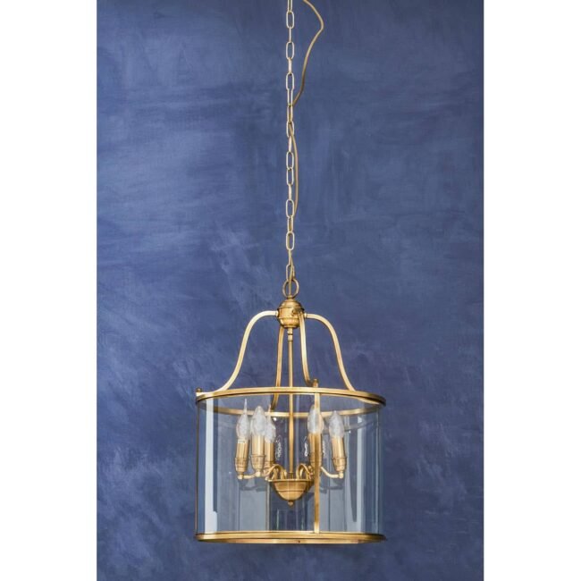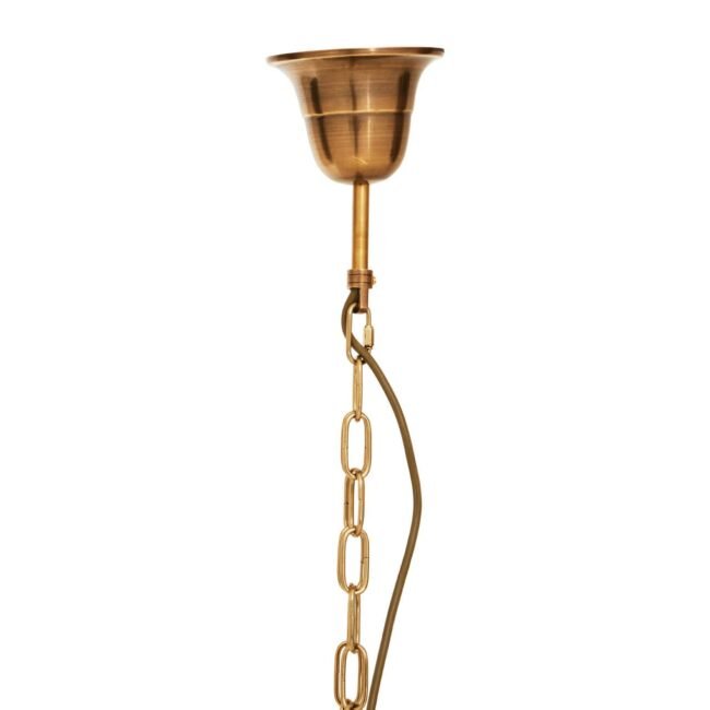 This four-pronged pendant light is attached to an adjustable chain and features a circular profile. Skillfully handcrafted, the clear glass panes are adjusted neatly in the brass finish frame allowing the six bulbs to lend a warm glow in the living area.