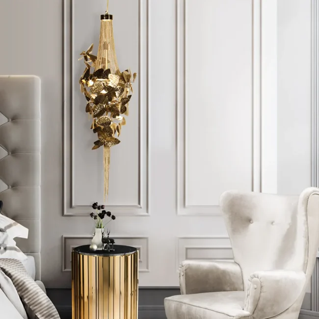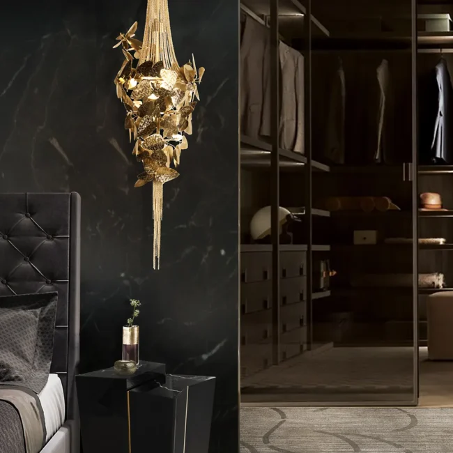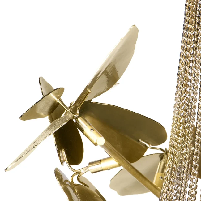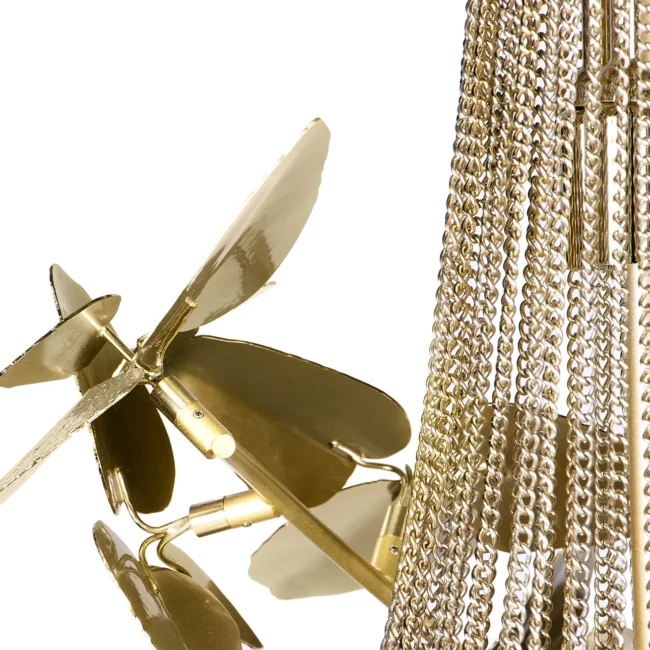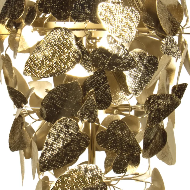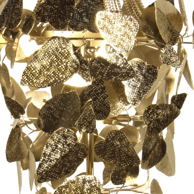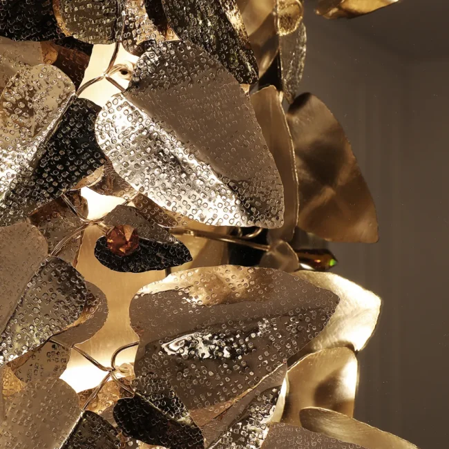 The McQueen Pendant Lamp presents a dramatic design tied with a simple string. Each leaf of hammered brass and every crystal exude a bold and feminine allure that will transform any interior decor, commercial or residential.MATERIALS
