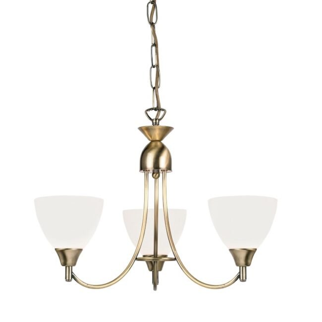 A 3 light ceiling pendant with a satin chrome and opal glass finish, can also be converted to a semi flush fitting. It is both dimmable and suitable for use with LED lamps. Matching items available in this range, and also comes in antique brass.