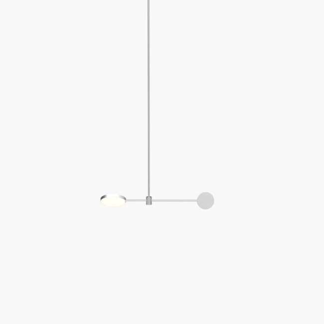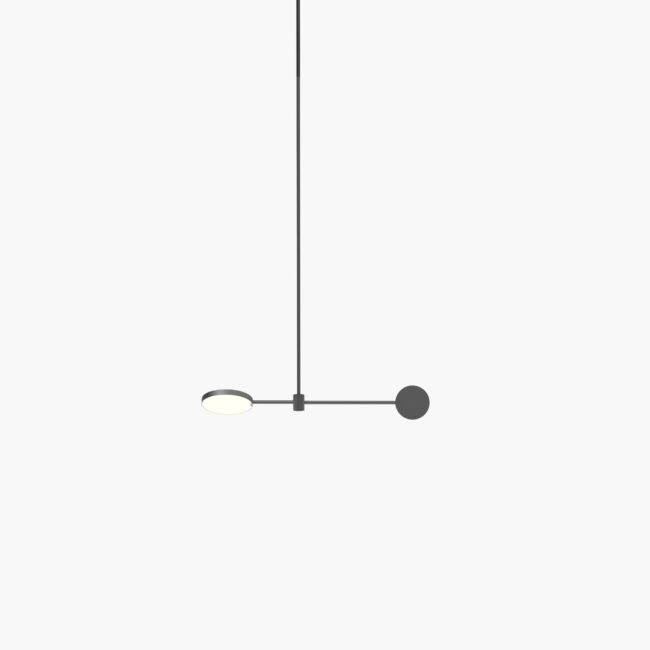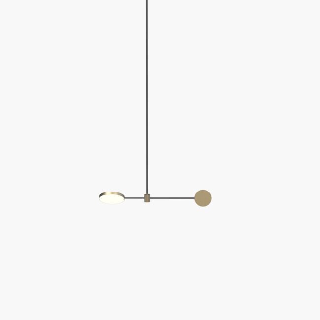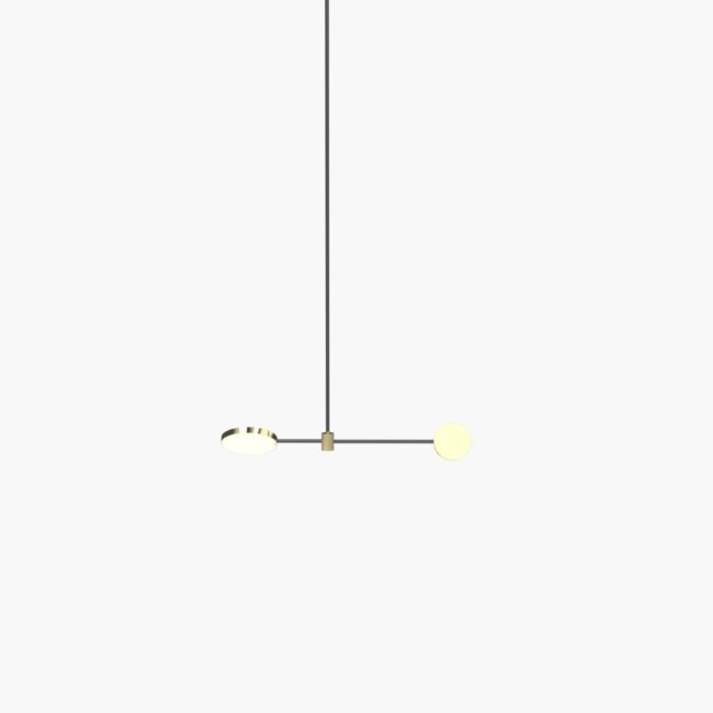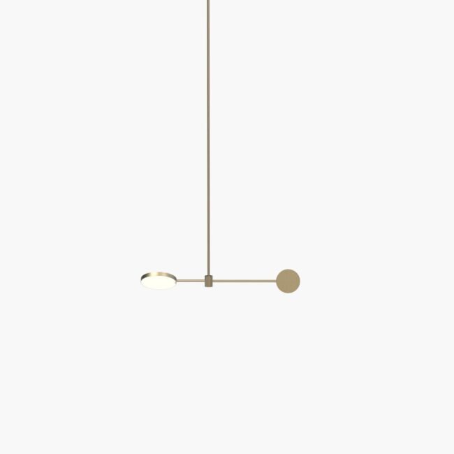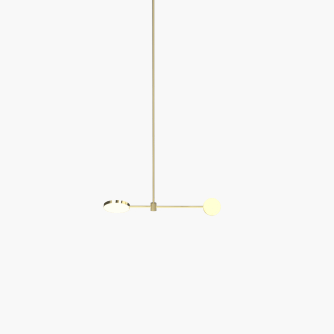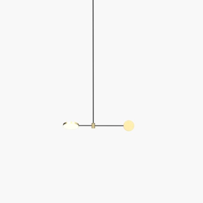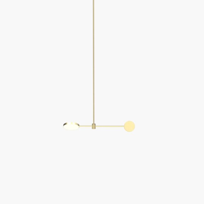 Metal rods hang at opposing angles, balanced by illuminated brass discs. Machined from solid aluminium and brass.