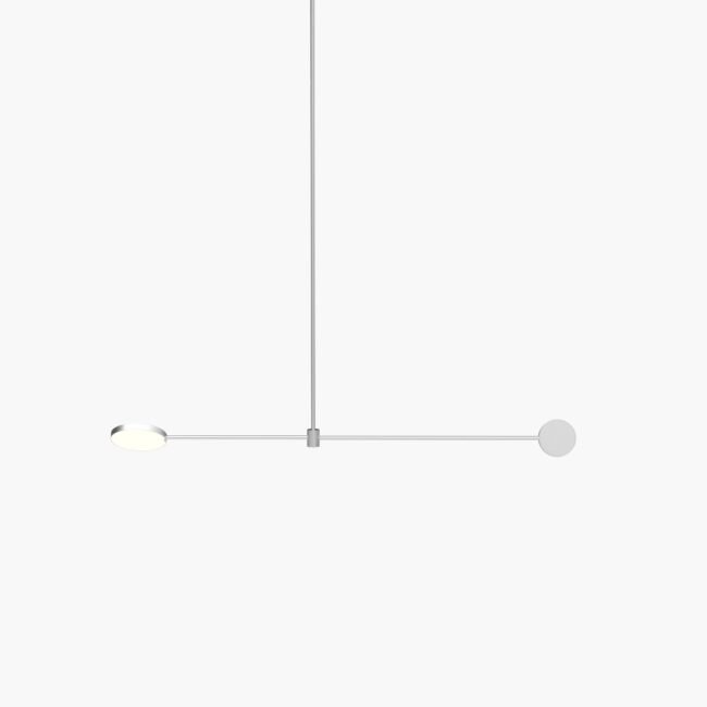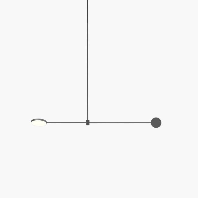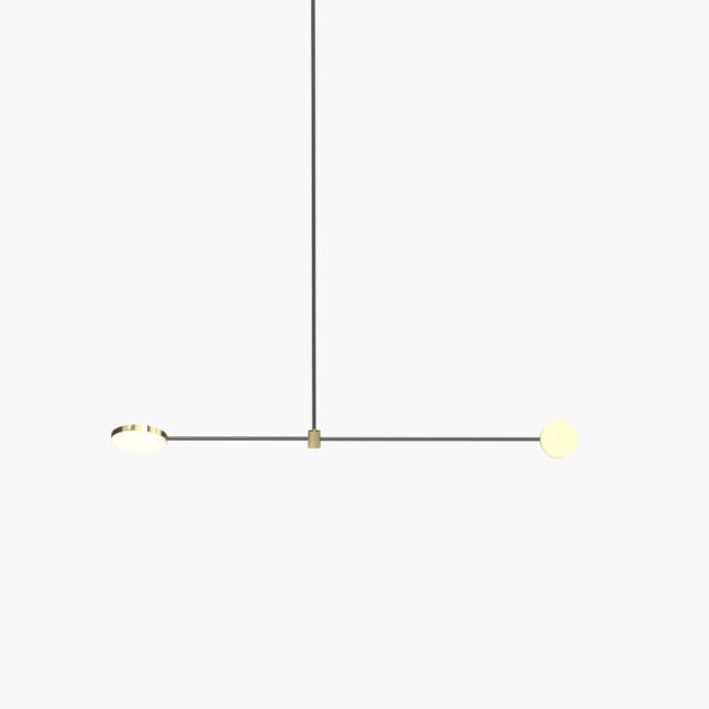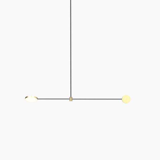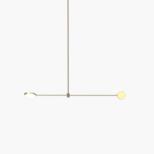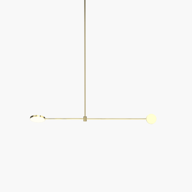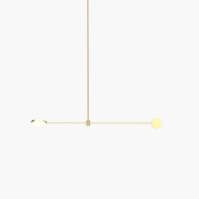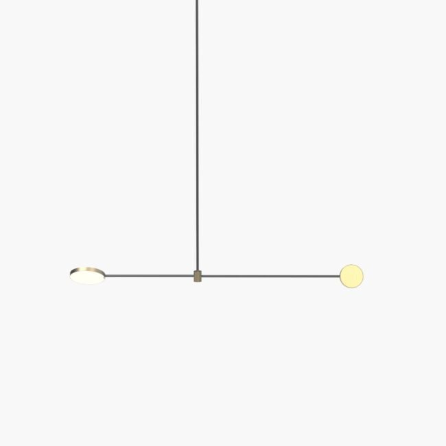 Metal rods hang at opposing angles, balanced by illuminated brass discs. Machined from solid aluminium and brass.