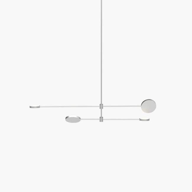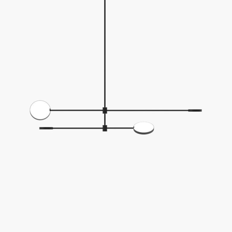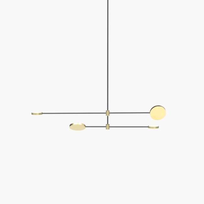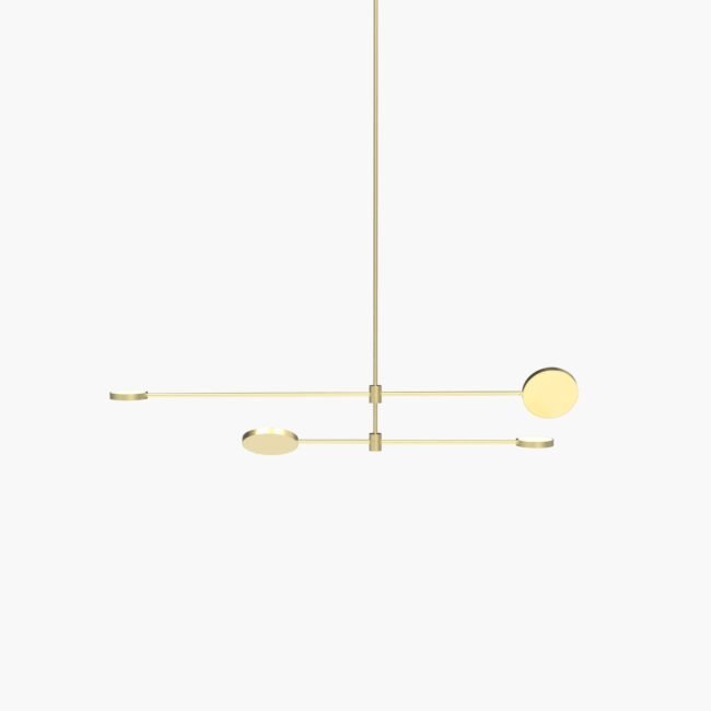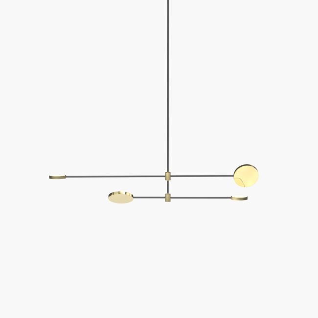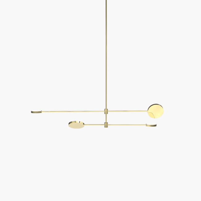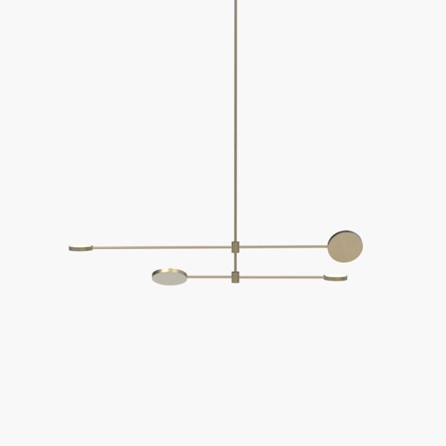 Metal rods hang at opposing angles, balanced by illuminated brass discs. Machined from solid aluminium and brass.