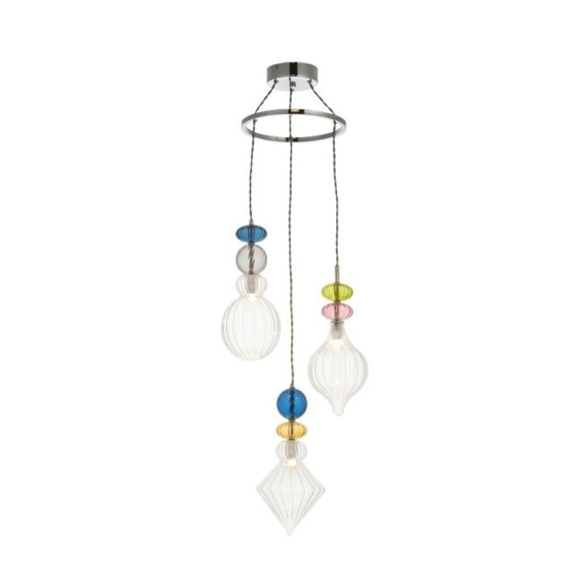 Add a touch of colour and detail with this 6 light pendant perfect for creating a decorative statement in any space. A modern classic design style with delicately twisted multicolour and clear glass; this product is dimmable and height adjustable so you can adapt to your space and create the perfect lighting feature. Matching 3 light also available.
