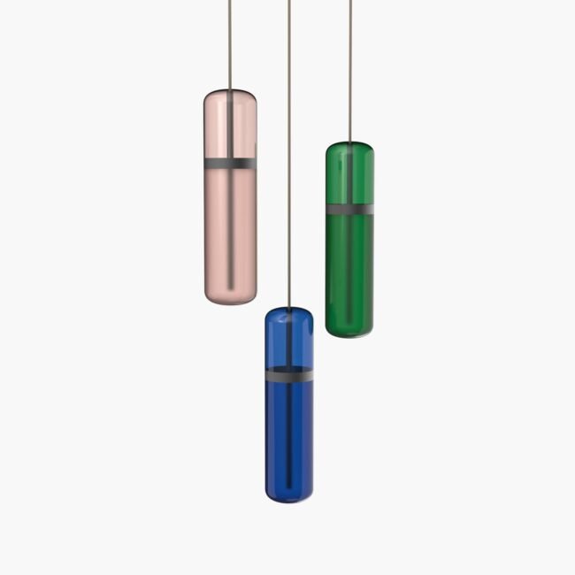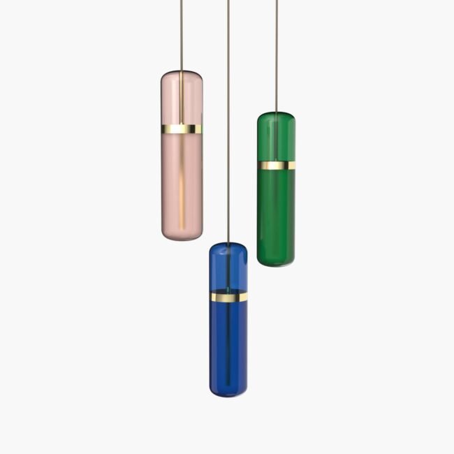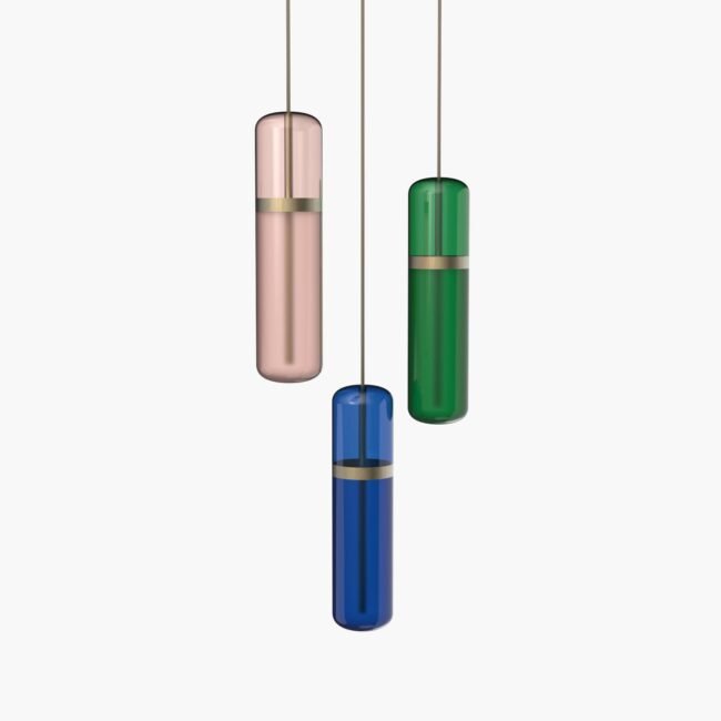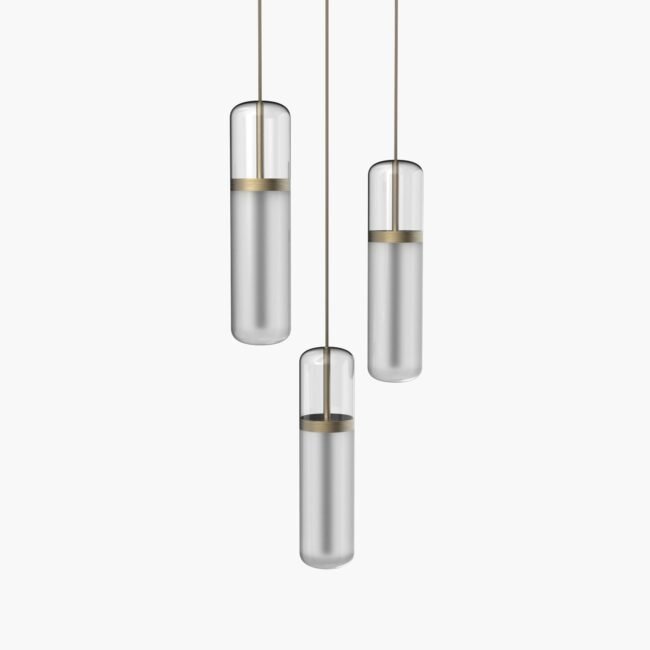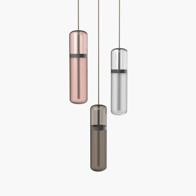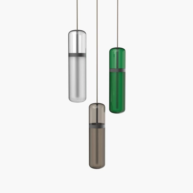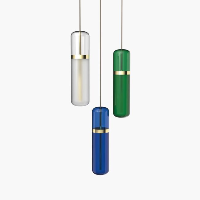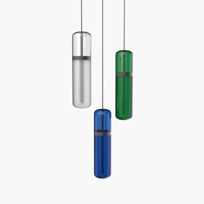 A capsule-shaped pendant made from handblown glass. Designed to be hung individually or in a cluster. Machined from cast brass or aluminium depending on finishing choice.