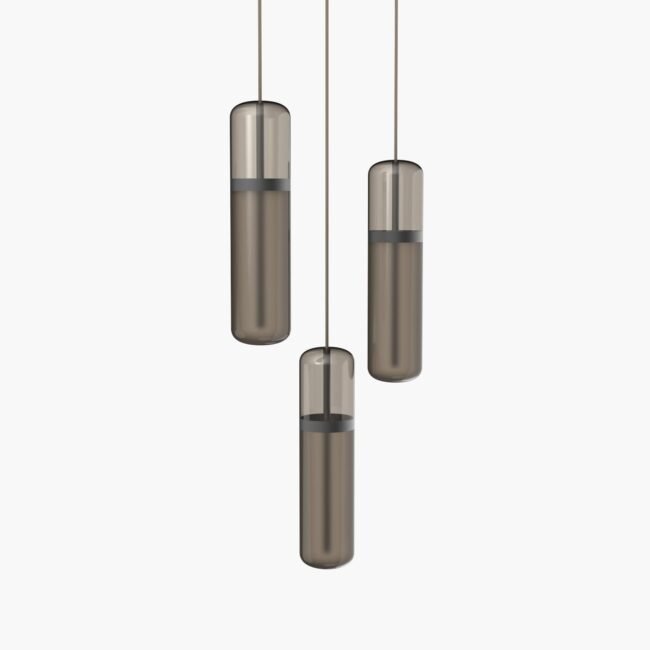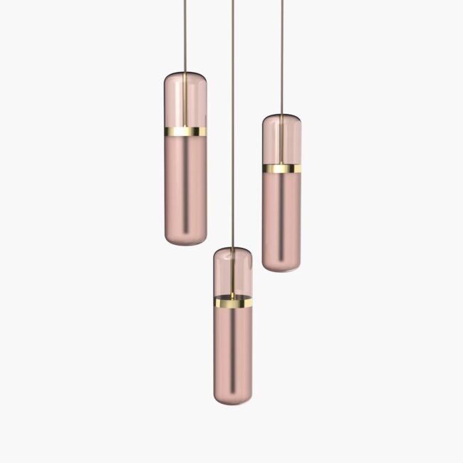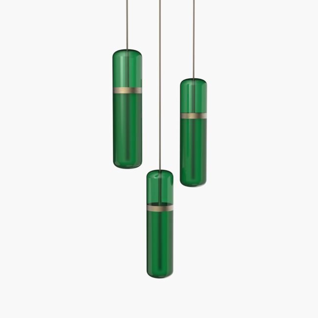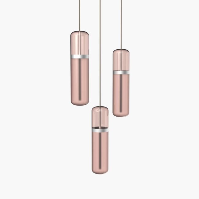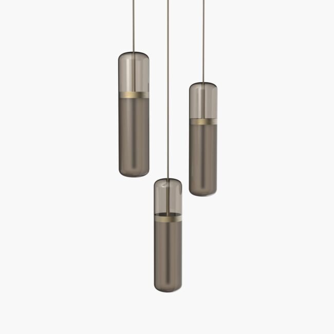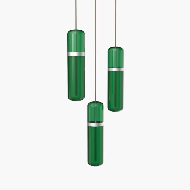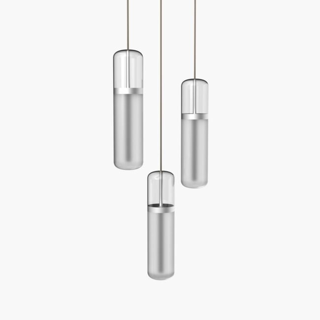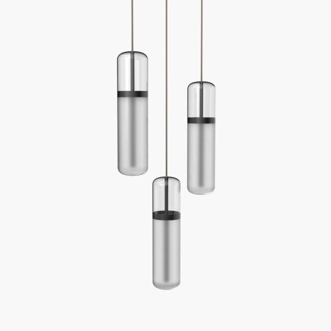 A capsule-shaped pendant made from handblown glass. Designed to be hung individually or in a cluster. Machined from cast brass or aluminium depending on finishing choice.