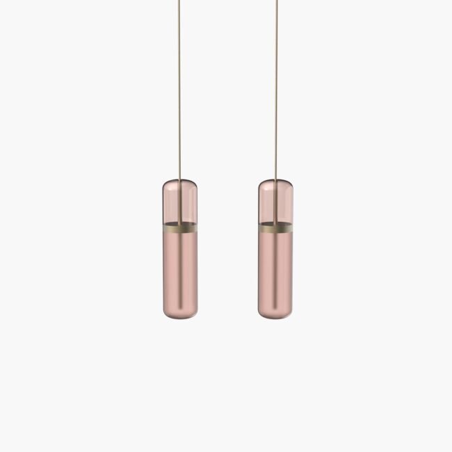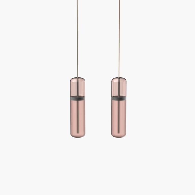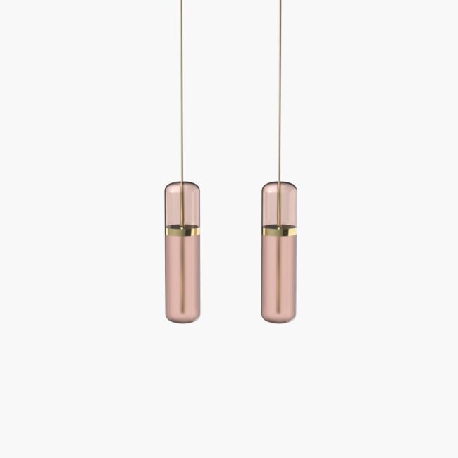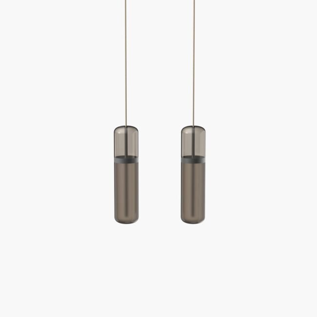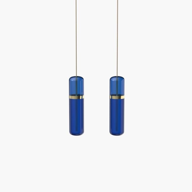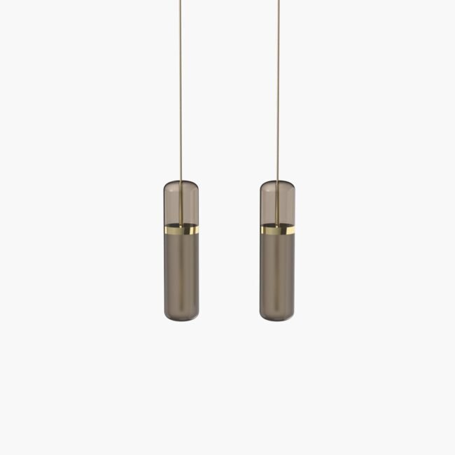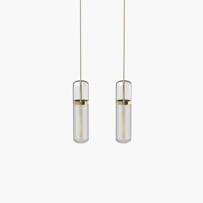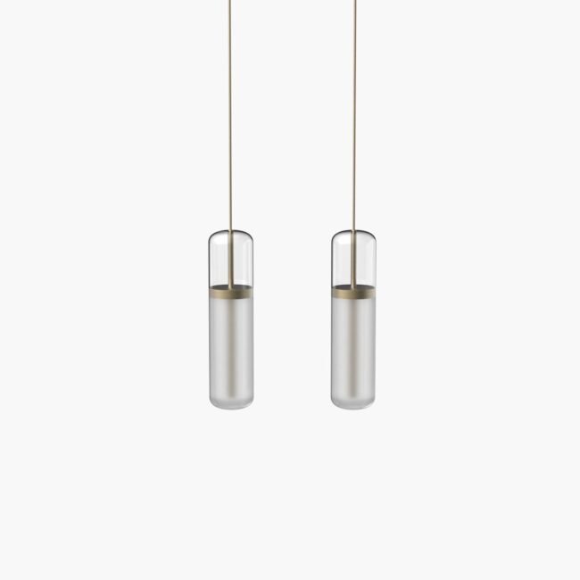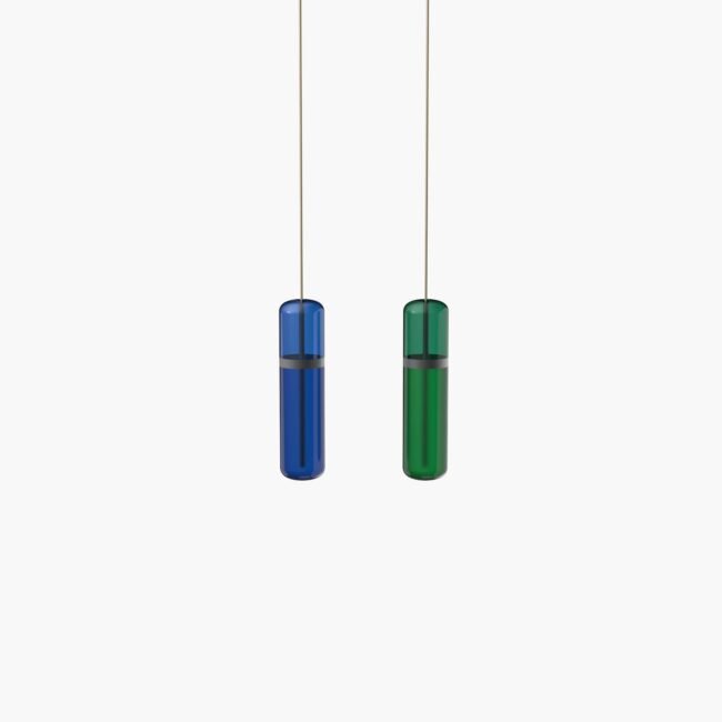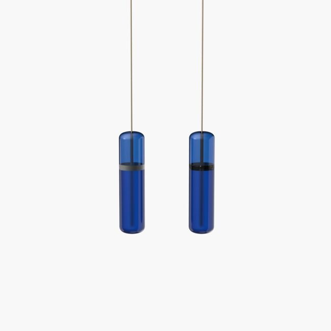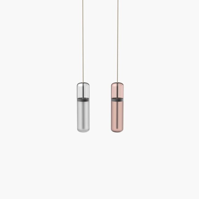 A capsule-shaped pendant made from handblown glass. Designed to be hung individually or in a cluster. Machined from cast brass or aluminium depending on finishing choice.