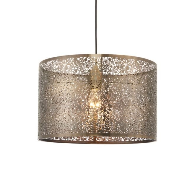 Non-electric pendant designed with a secret garden detailing of leaves, dragonflies and birds, with an antique brass finish. Casts a decorative light pattern. Others available in this range