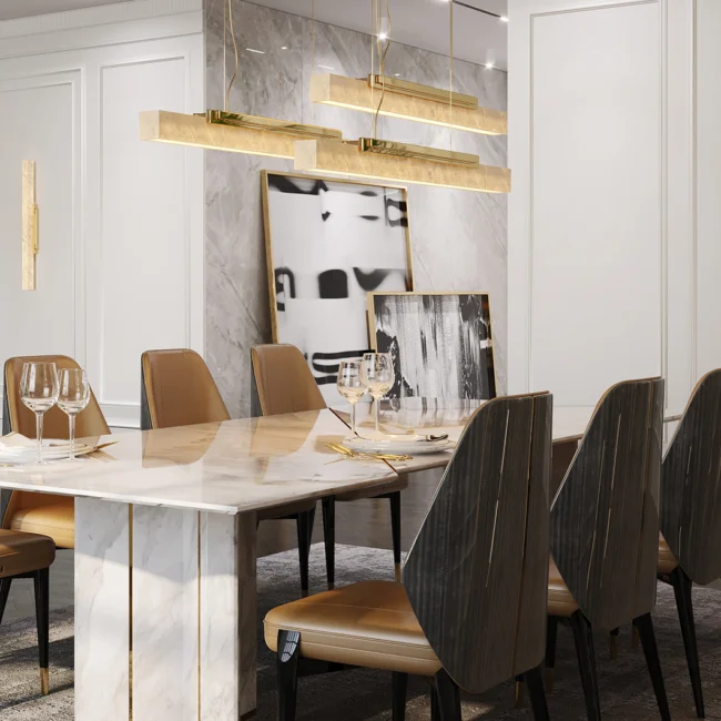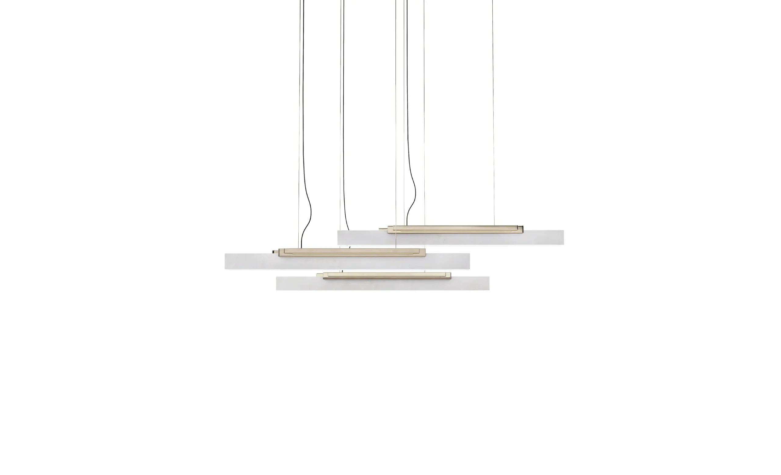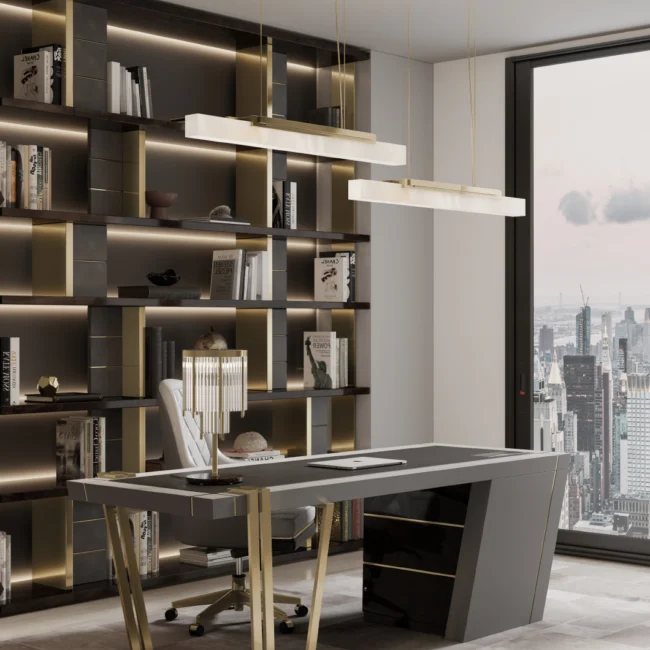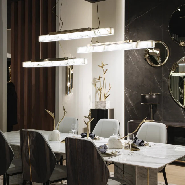 The Skyline III Suspension Lamp is a modern ensemble of three radiant luminaries suspended from a graceful canopy. Inspired by the dynamic cityscapes of bustling metropolises, the alabaster’s delicacy, and the brass’s sophistication come together to create an exceptional lighting solution for the most exclusive interior design projects.
