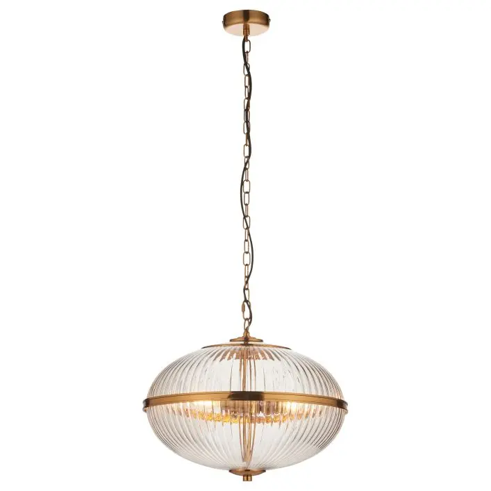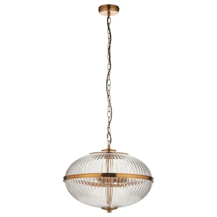 Somer 3 Pendant Light Vintage Brass: This elegant 3 light pendant features a striking ribbed 2 part glass globe with a shaped warm brass band for a refined yet timeless aesthetic. Suspended from a height adjustable chain set with grey braided fabric flex, it effortlessly combines classic detailing with contemporary sophistication. Ideal for living spaces, bedrooms, stairwells, or over dining areas, it provides a warm, ambient glow while serving as a stunning focal point.