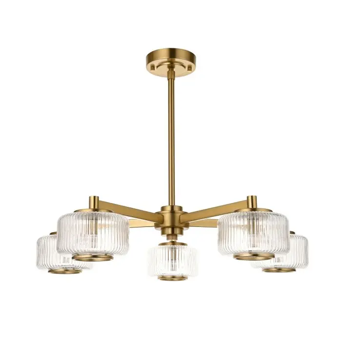 Tams 5 Pendant Light Brushed Aged Brass: This 5 light ceiling light blends timeless mid-century style with contemporary flexibility. Featuring elegantly ribbed glass shades and a warm brushed aged brass metal finish, it delivers a sophisticated yet soft illumination. The telescopic stem allows for adjustable height, making it ideal for dining rooms or living spaces where both style and practicality are key.