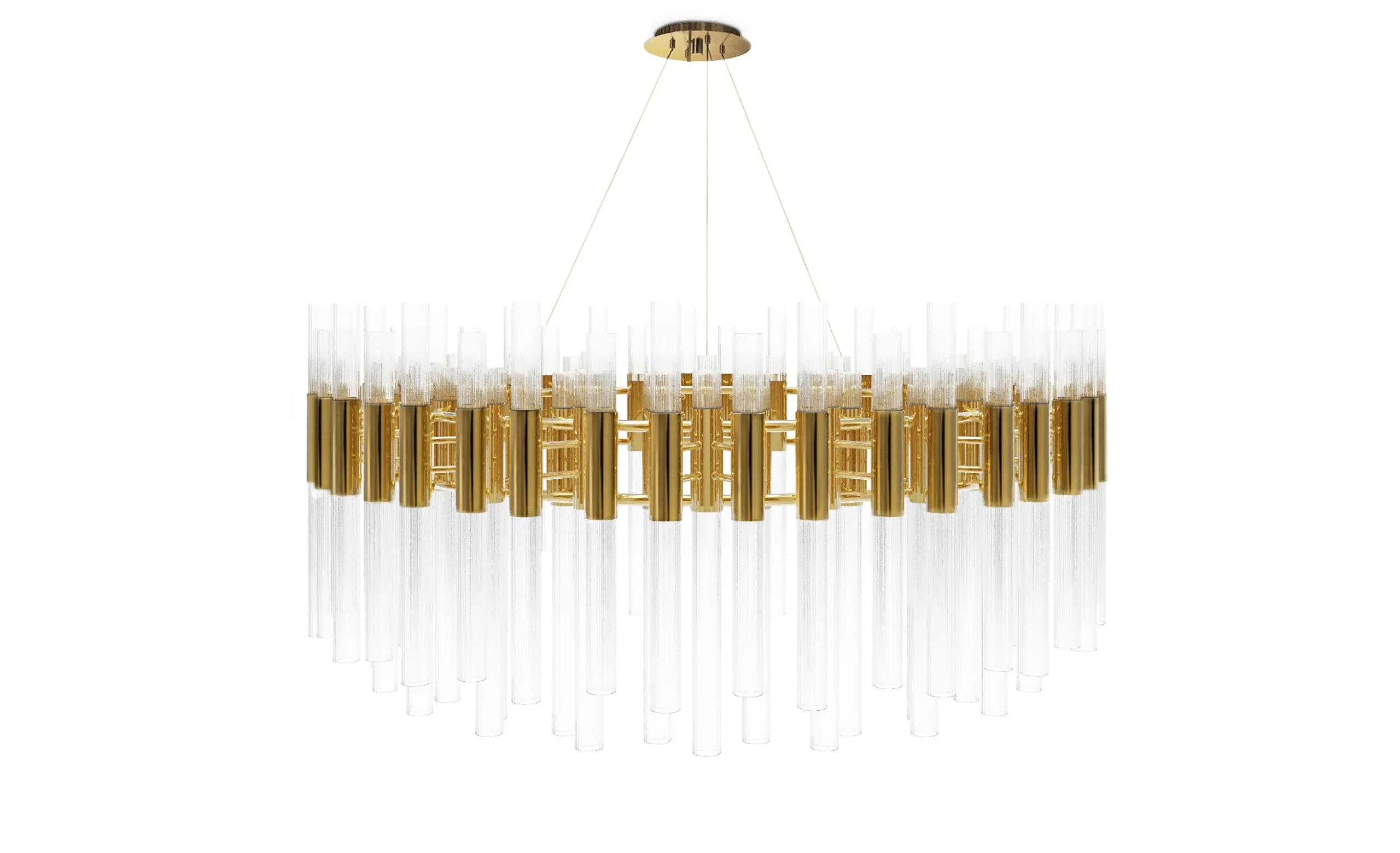 The Waterfall Round Suspension Lamp is an alluring lighting fixture that features a circular shape made of gold-plated brass and ribbed crystal glass tubes. Its design creates a charming waterfall sensantion, making it the perfect statement piece for any interior decor.MATERIALS