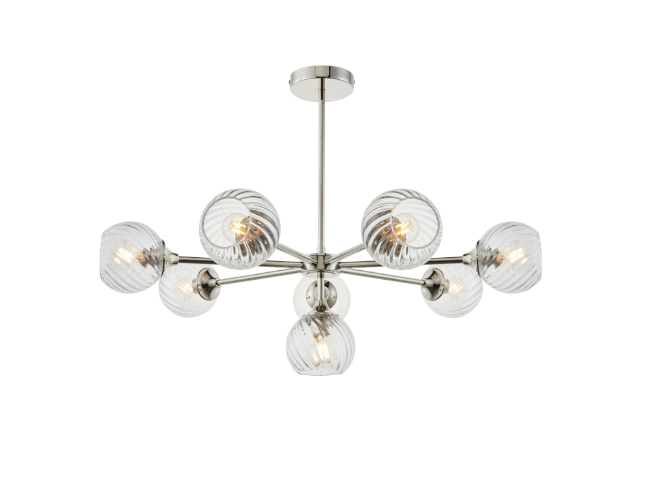 Twisted glass shades give this ceiling light a decorative edge. This 8 light semi flush is perfect for casting light around rooms with low ceilings, finished in a stunning bright nickel plate. Matching items also available to complete the look.