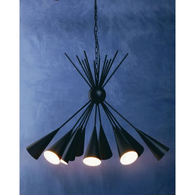 Made from matte black metal, a cluster of lights emanate out of a hanging ball to create a sputnik design. The twelve conical shades add to the mid century aesthetic.