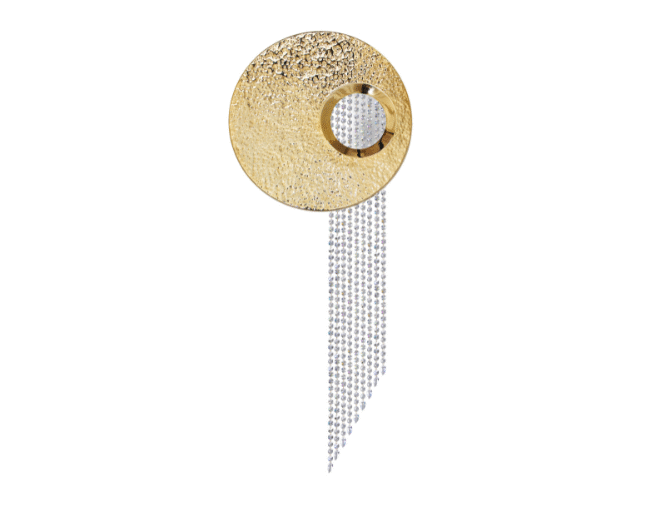 This lighting wall sconce was created in order to be perfect, functional, and practical. Stunning delicate crystals emerge from the middle of the delicately hammered gold plated brass, allowing the light to spread to the surrounding space and creating the perfect ambiance in the area. Ravel Wall Light suits flawlessly above a modern console or as a hotel hallway entrance.
