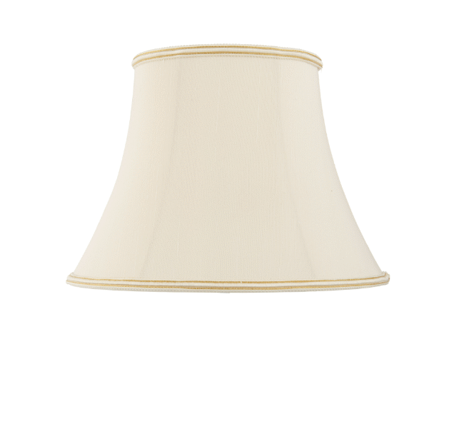 A classic 20 inch handmade lamp shade is a balloon lined bowed oval in a cream fabric with a subtle woven trim on the top and bottom edges. Available in a choice of sizes. Note – this shade has a fixed gimbal and is not suitable for use with pendants.