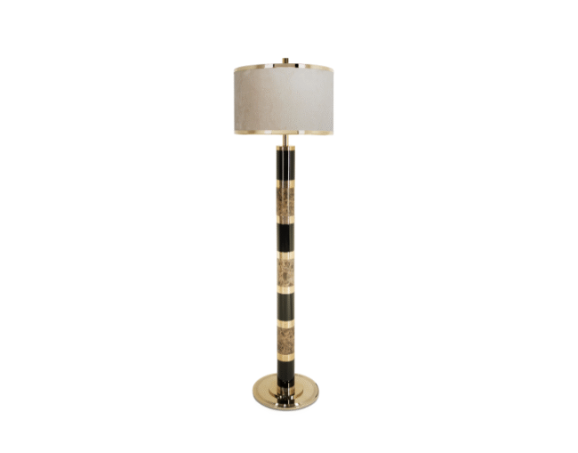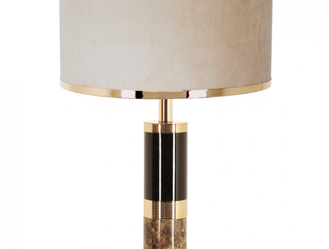 In this uplight, we can find emperador, a beautiful brown marble with soft golden threads. This stone conveys elegance to the whole design. Alongside the black lacquered wood and gold-plated brass rings, these are noble materials that confer grace and soften this bespoke piece. This brilliant combination of these three materials results in a premium piece that fits in with distinctive and refined decors. Sparta Floor Lamp