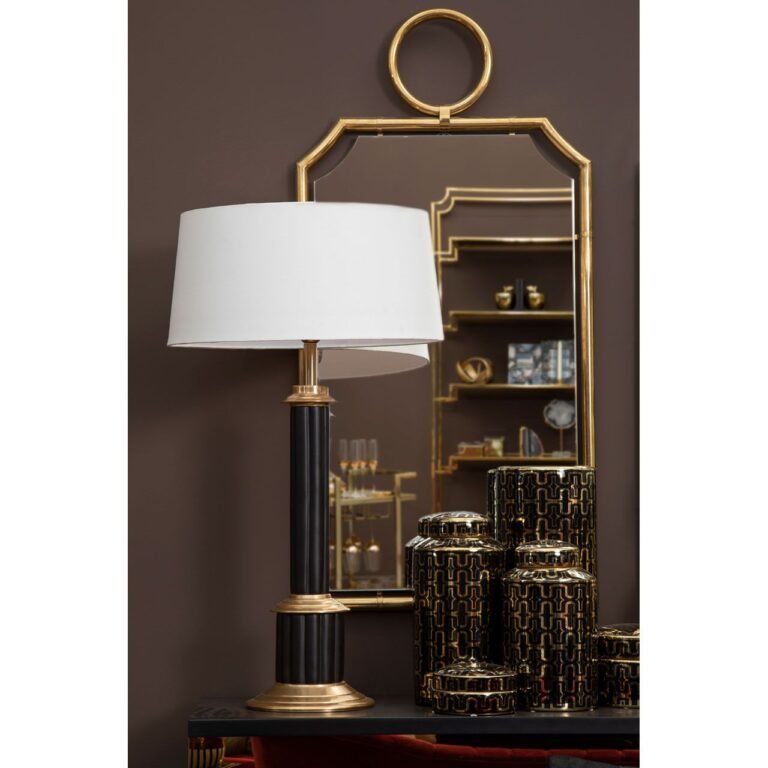 This stepped design Axey Column Table Lamp is finished in black and gold shades while its exterior surface is adorned with a ribbed texture. It is contrasted by a white fabric tapered shade which complements the tiered pedestal. Stylish and elegant, this floor lamp has pleasing aesthetic which enhances its visual appeal.