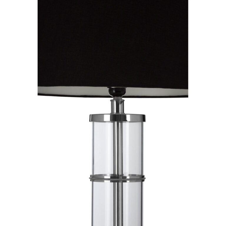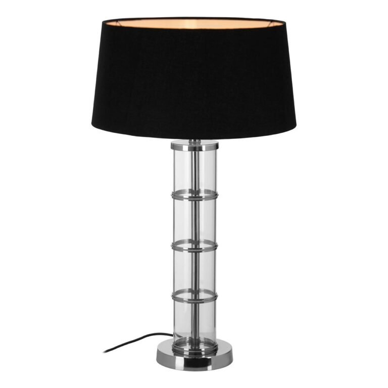 Damile Table Lamp: The base and stand of the Camile table lamp are made from brass and boast a nickel coating for a reflective finish. A clear acrylic cylinder covers the stand, and features nickel finished rings at sequential points. The shade is made from soft fabric and coloured black, giving the lamp a monochrome look.