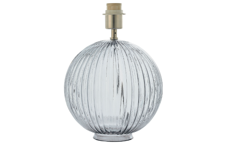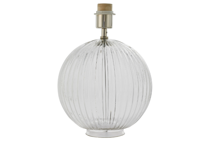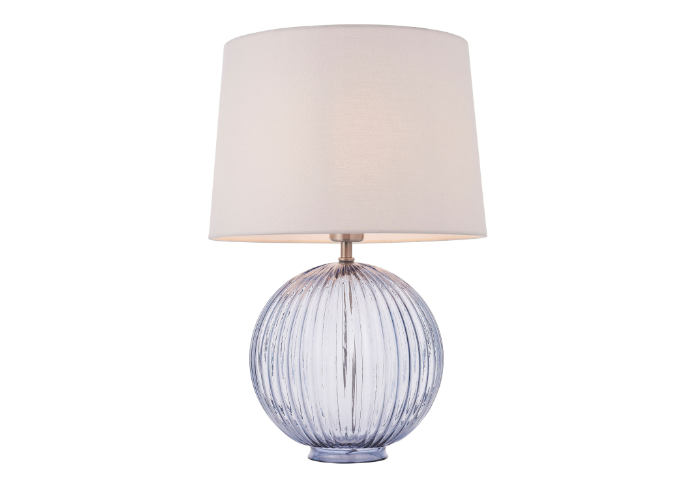A striking and shapely table lamp with a distinctive clear ribbed glass base with a satin nickel plate finish. This lamp will blend in beautifully with most interior styles. Complement with a soft pastel or vibrant shade to complete the look.