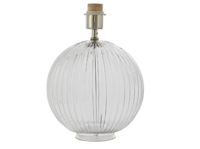 A striking and shapely table lamp with a distinctive clear ribbed glass base with a satin nickel plate finish. This lamp will blend in beautifully with most interior styles. Complement with a soft pastel or vibrant shade to complete the look.