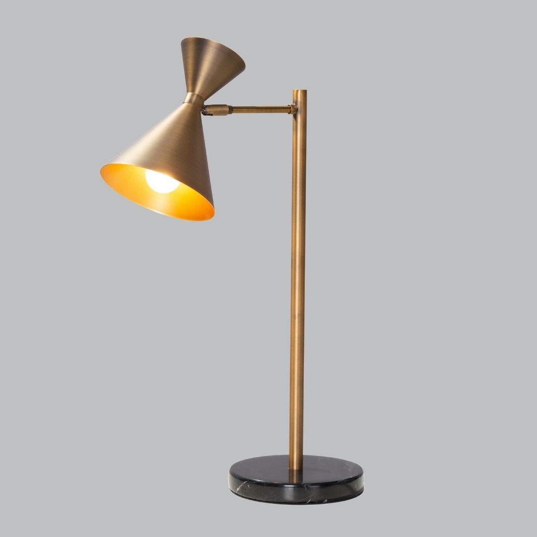 Add a touch of geometric elegance and warm metallic tones to your workspace with the Fatu Desk Lamp. Its sleek black marble base provides a modern anchor for the eye-catching hourglass-shaped brass shade, which focuses light beautifully for task work. This lamp combines style and functionality in a striking design.