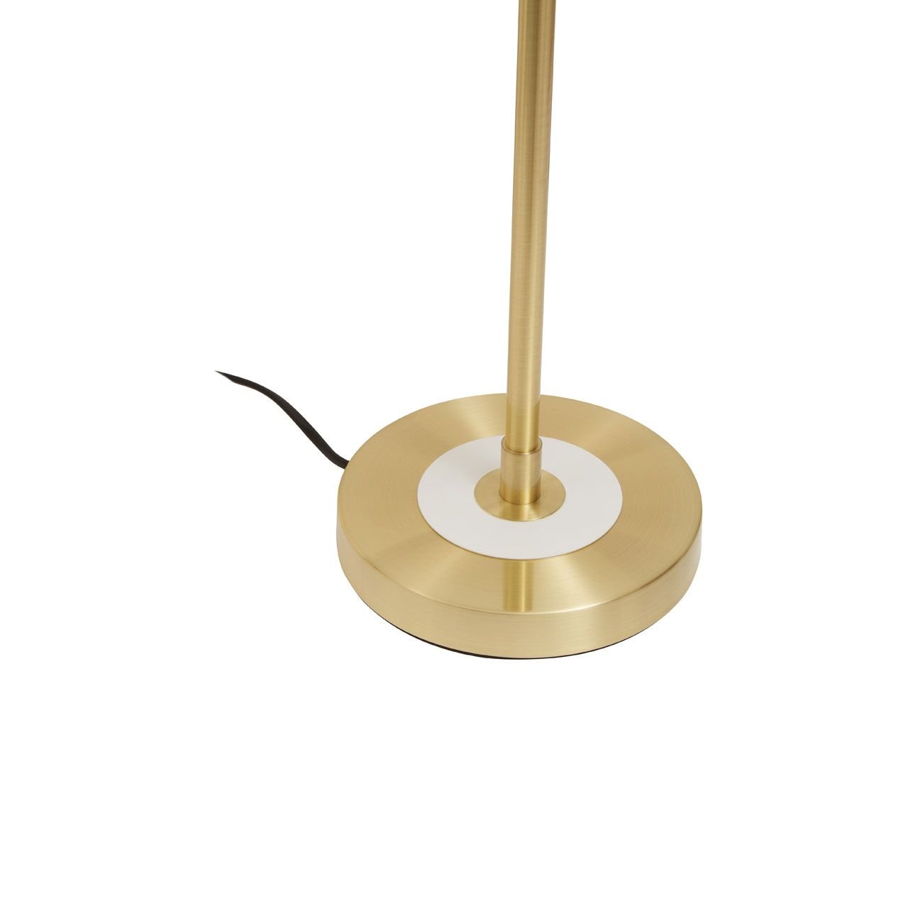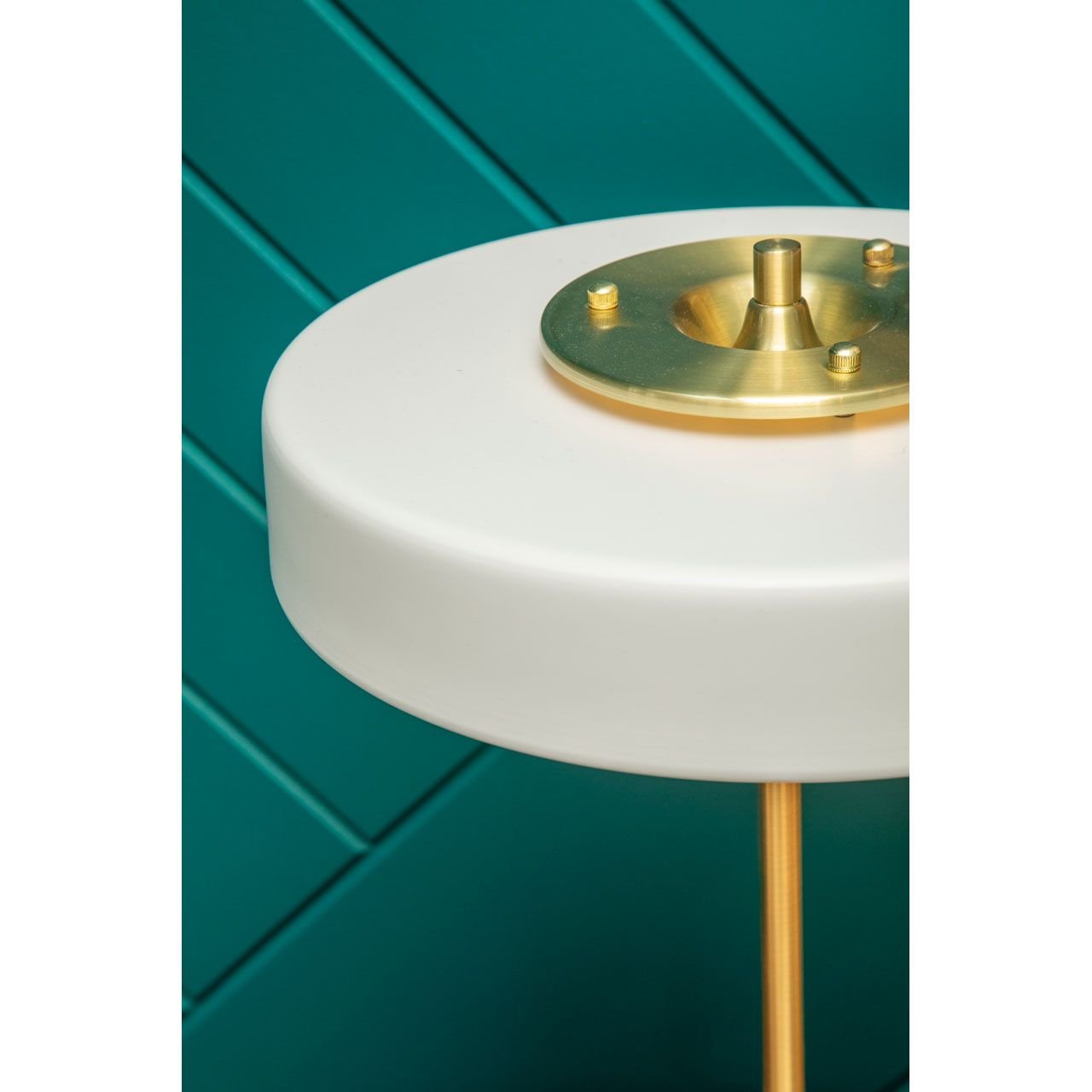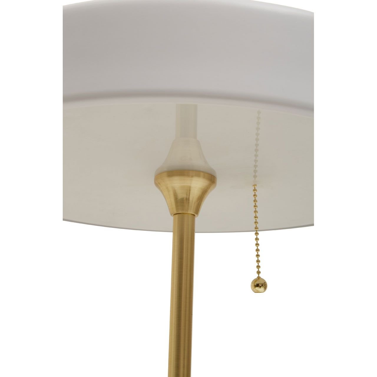 The Ganor Table Lamp has a clean lined base in the brushed brass finish that contrasts the soft white spun shade. A brass pull chain switch hangs over a solid brass base and adds to the aesthetic.